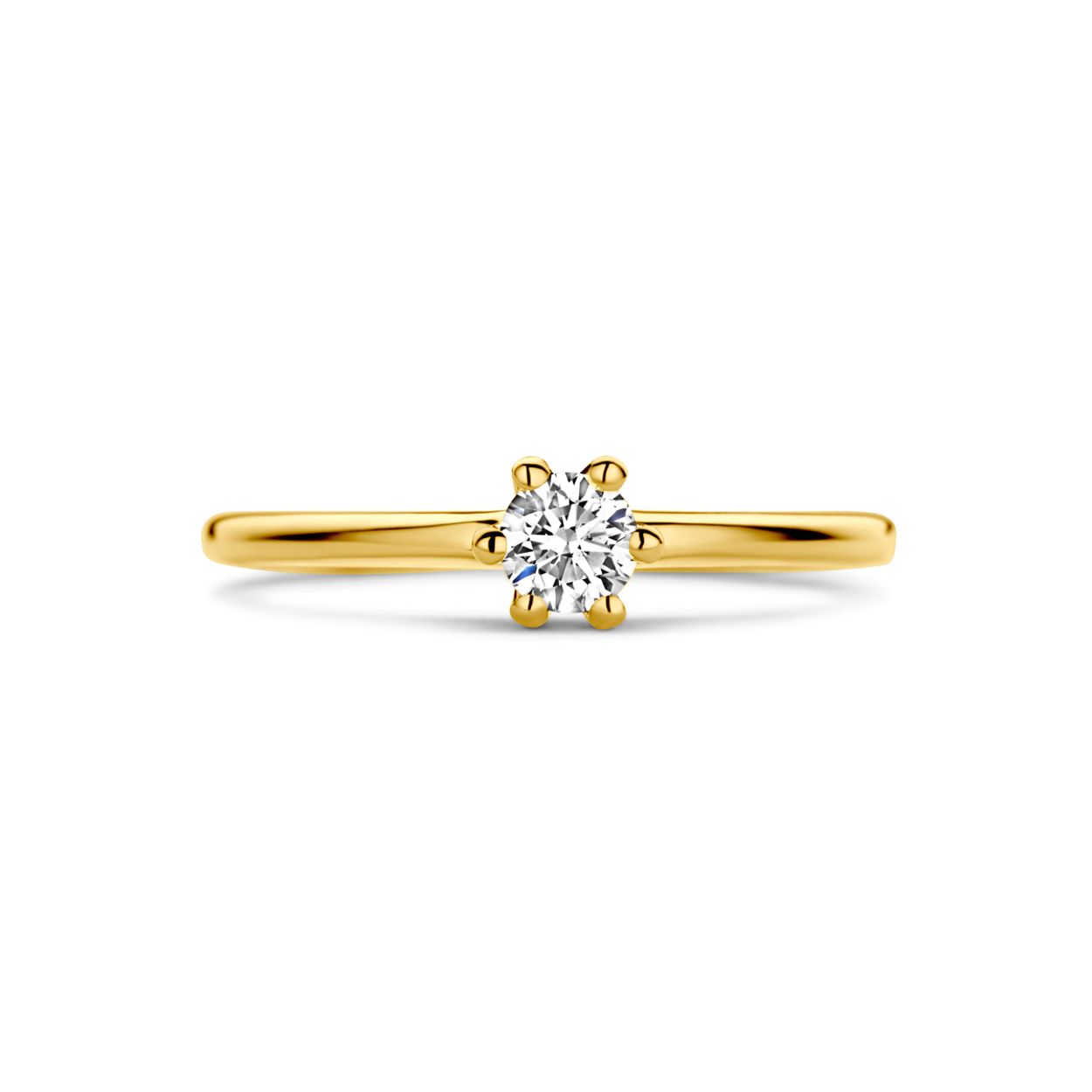 14k Geelgouden ring uitgevoerd met diamant. De ring heeft een breedte van 4,2mm.