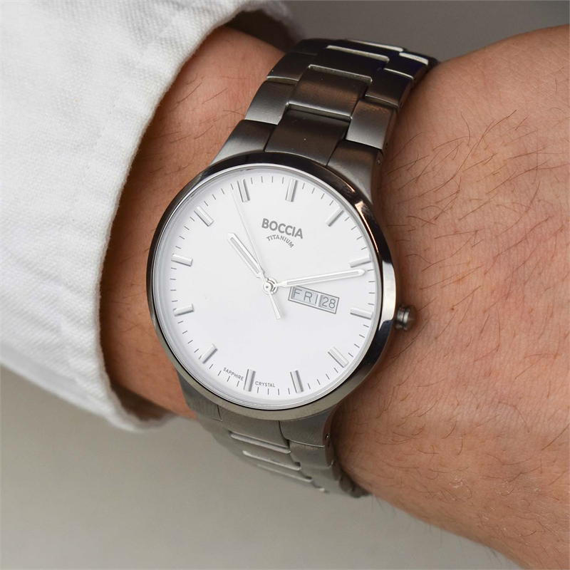 Dit herenhorloge van Boccia Titanium heeft een nette uitstraling. De zilverkleurige titanium horlogekast zorgt voor een stijlvolle look en de witte wijzerplaat maakt het horloge klassiek. Het horloge heeft een ronde kast met een diameter van 39mm, een dag, een datum, een saffierglas, en is 5ATM. Combineer dit prachtige exemplaar met de andere sieraden van Boccia Titanium voor een complete look. Aan de titanium kast zit een titanium band.