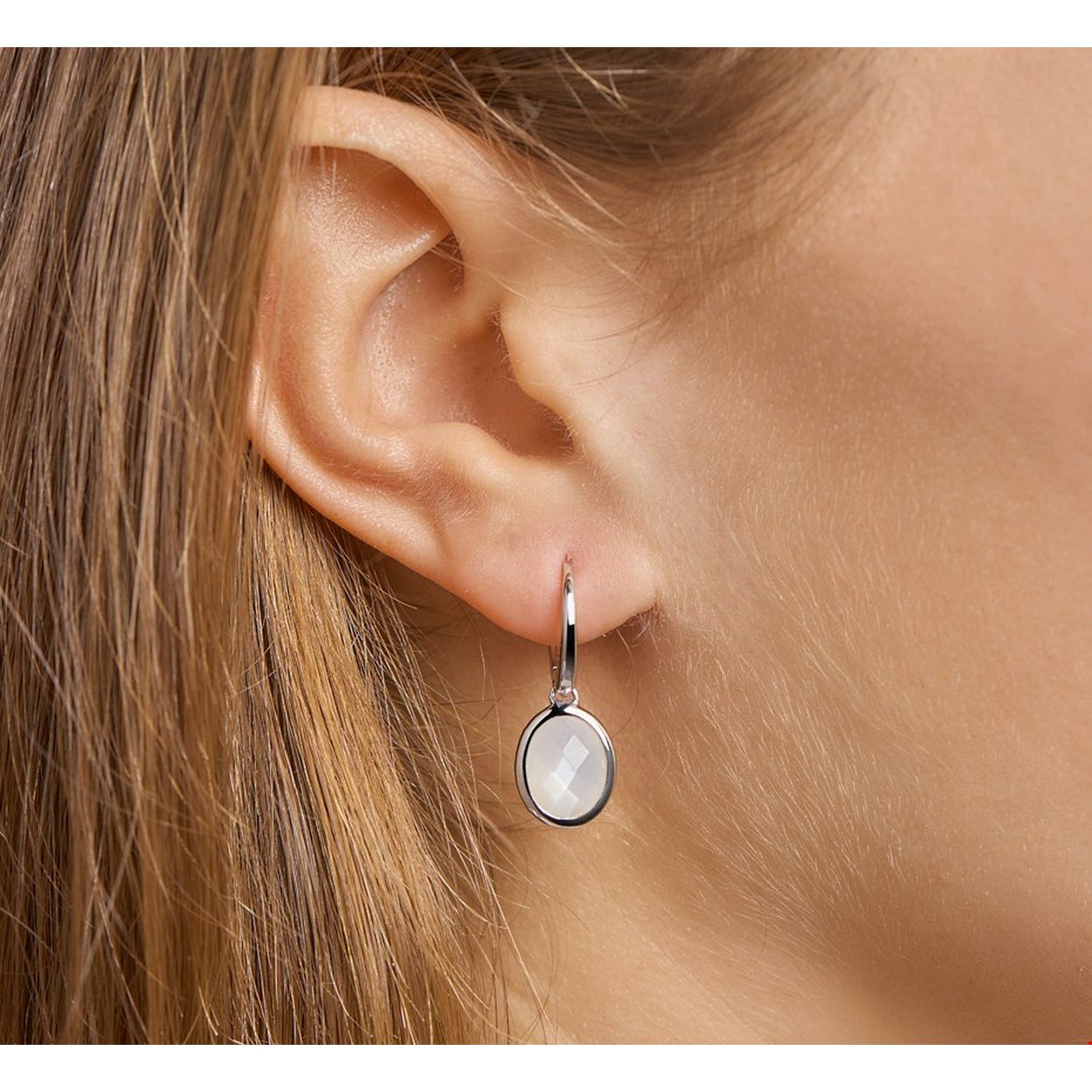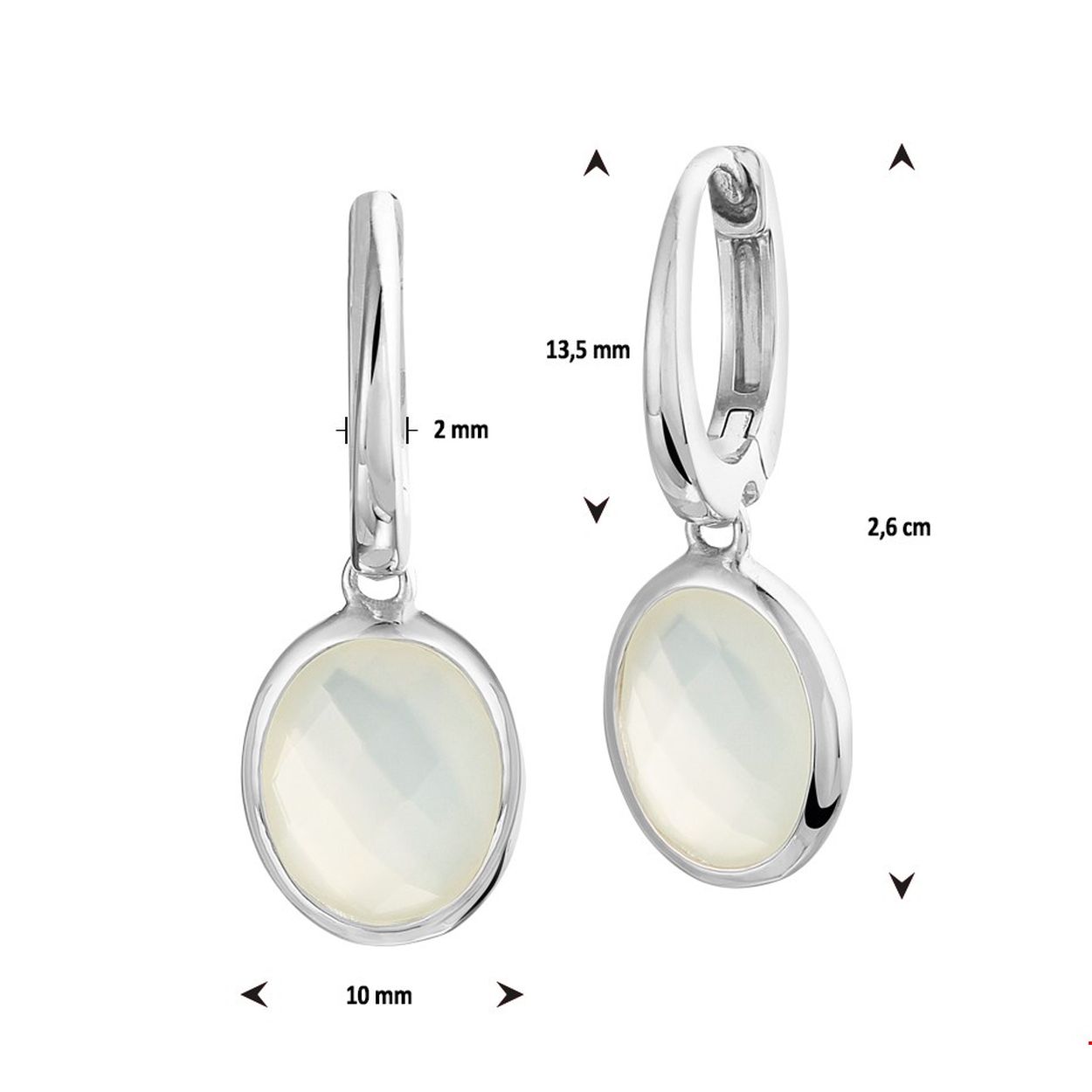 Beschrijving: Chique gerhodineerd zilveren oorringen uitgevoerd met schitterende wit maansteen hangers en een stevige scharnier sluiting. De klapcreolen hebben een totale hoogte van 2.6cm en de hanger heeft een afmeting van 14.5x10mm.