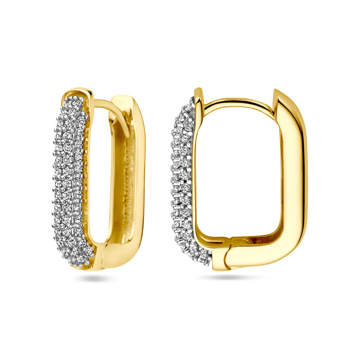 14k Geelgouden klapoorringen uitgevoerd met zirkonia. De klapoorringen hebben een afmeting van 19x4mm.