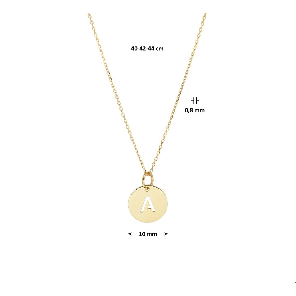 14k Geelgouden anker collier uitgevoerd met een ronde letter A hanger. De hanger heeft een diameter van 10 mm en het collier heeft draaglengtes van 40 42 en 44cm. Tip: Geef dit betekenisvolle collier cadeau aan een speciaal persoon.